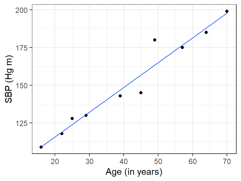 Let, \(Y\)=Systolic blood pressure, SBP and \(X\) = age (in years)