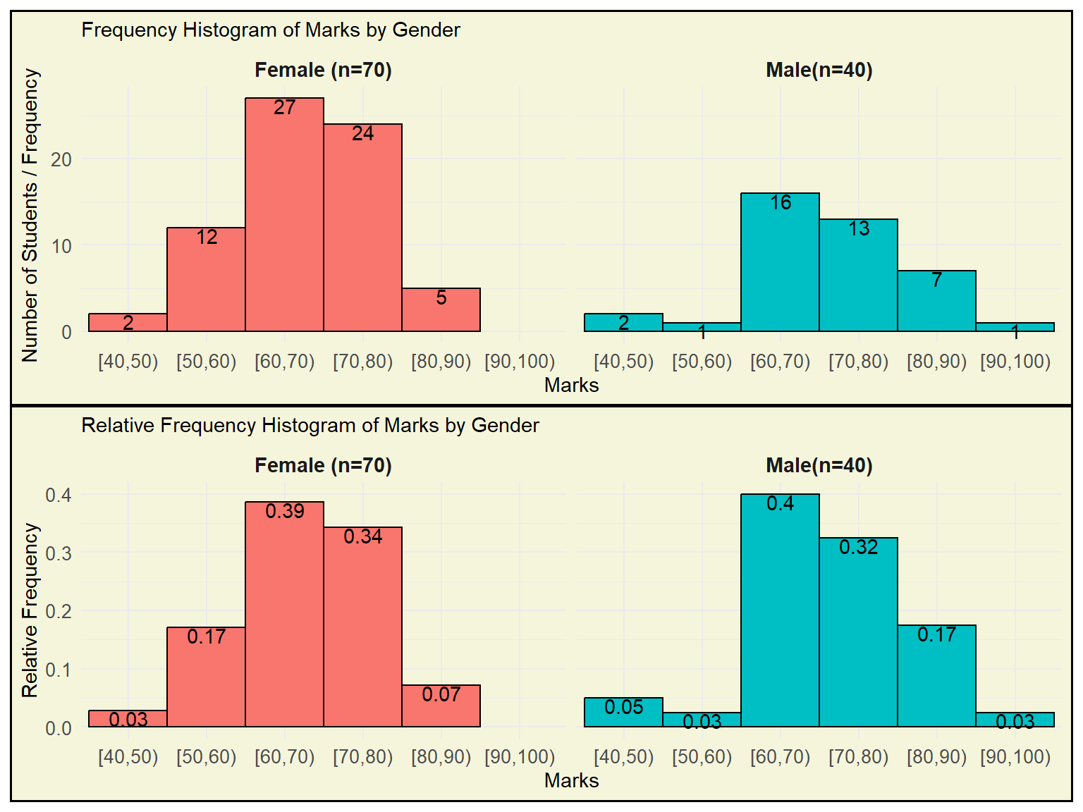 The frequency histogram shows how many students fall into each marks range (bin). However, since the number of female students (70) is greater than male students (40), their bars are naturally taller — even if the relative performance is similar. This makes direct comparison unfair and misleading.