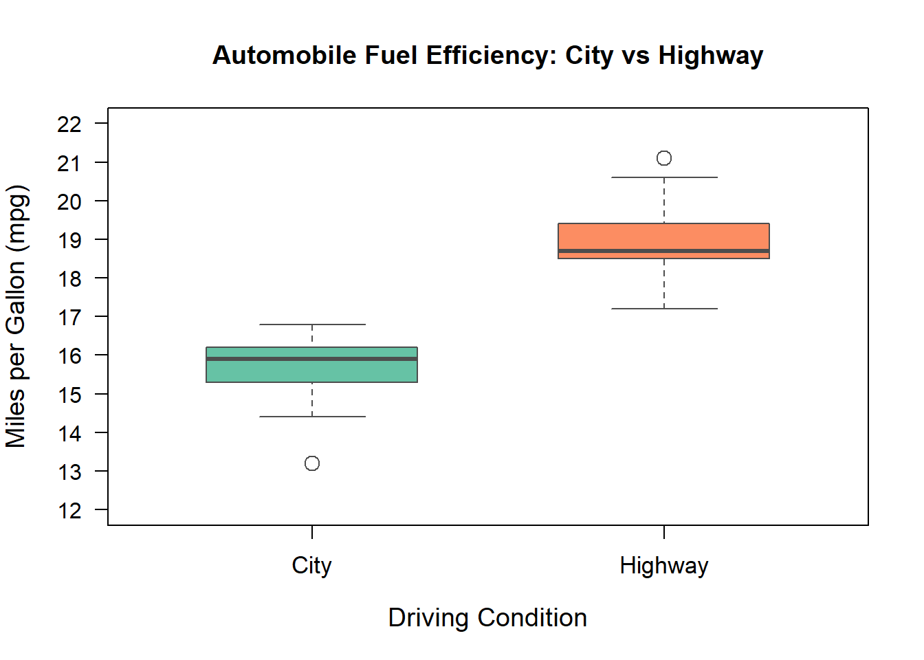 3.9 Automobile Fuel Efficiencies. In automobile mileage and gasoline-consumption testing, 13 automobiles were road tested for 300 miles in both city and highway driving conditions. The following data were recorded for miles-per-gallon performance.
