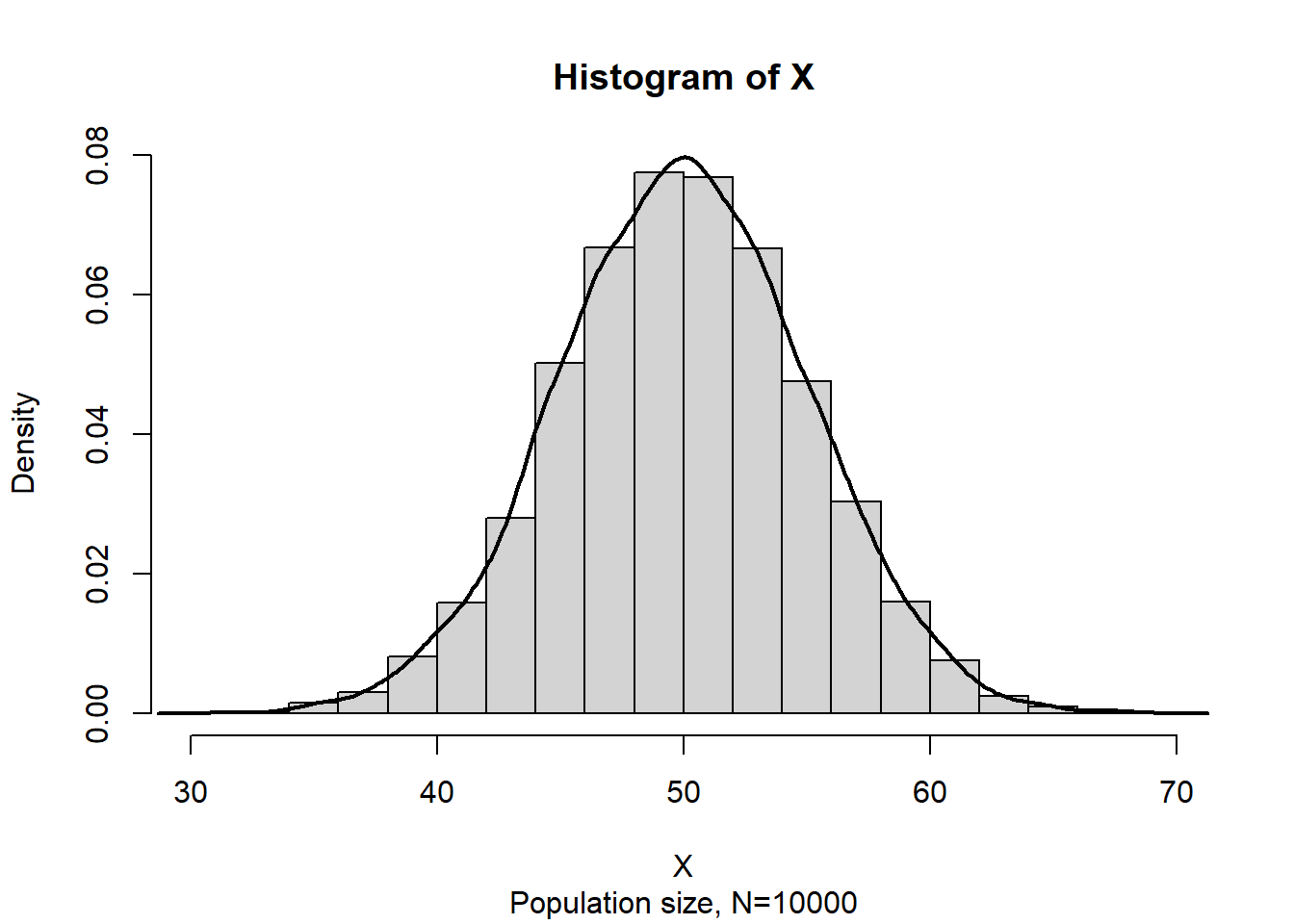 Suppose \(X\sim N(50,5^2)\) . Now consider a population data of size \(N=10000\) and the histogram of \(X\) is: